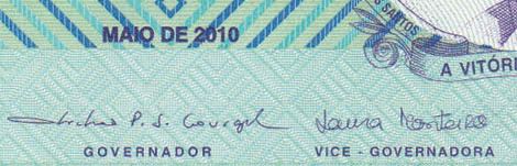 50 reals (US$27), 2010. Like new 50-real note issued 13.12.2010, but new signatures (Guido Mantega and Alexandre Antonio Tombini).