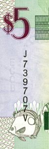 5 dollars (US$2.50), ND (2007). Issued August 20, 2007. Like SCWPM 61, but broken trident added to map wmk, windowed security thread with CBB repeating, numeral in top left corner intaglio printed. Printer: De La Rue.