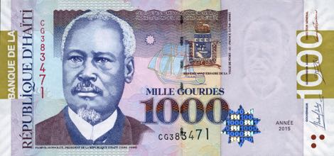 1,000 gourdes (US$26.15), 2007. Like P278, but new date and names removed above signatures. Printer: DE LA RUE.