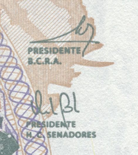 Brown, green, blue, and purple. Front: Sunburst as registration device; green-to-blue OVI flower; leaves on branches; OVI patch of solider with raised flag on horseback; Manuel Belgrano in military uniform; OVI patch of Pedrito Ríos, drummer boy of Tacuarí. Back: Juana Azurduy de Padilla and Manuel Belgrano on horseback with swords raised to new flag on 27 February 1812 along Paraná River; coat of arms; sunburst. Solid security thread with demetalized $10 BCRA. Watermark: Manuel Belgrano and electrotype MB. Printer: S.E. CASA DE MONEDA. 155 x 65 mm.