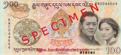 The Royal Monetary Authority of Bhutan has issued a 100-ngultrum (US$2.05) banknote to commemorate the 13 October 2011 royal wedding of King Jigme Khesar Namgyel Wangchuck and Queen Jetsun Pema. According to this BBS article dated 12 October 2011, the notes (and 500-ngultrum coins) are available in Bank of Bhutan, Bhutan Development Bank Limited, and in the BOB counter at the Paro Airport from 13 October until 4 November at a cost of 500 ngultrum and 5,000 ngultrum, respectively.