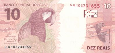 Red. Front: Plants; head of República. Back: Arara (macaw) bird. Solid security thread with demetalized 50 REAIS. Watermark: Macaw and electrotype 10. Printer: CASA DA MOEDA DO BRASIL. 135 x 65 mm.