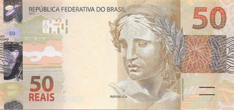 Brown and olive green. Front: Jungle plants; head of República. Back: Onça pintada (jaguar). Holographic stripe. Solid security thread with demetalized 50 REAIS. Watermark: Jaguar and electrotype 50. Printer: CASA DA MOEDA DO BRASIL. 149 x 70 mm. Signatures: minister of finance, Guido Mantega, and president of the bank, Henrique Meirelles. Intro: 13.12.2010.