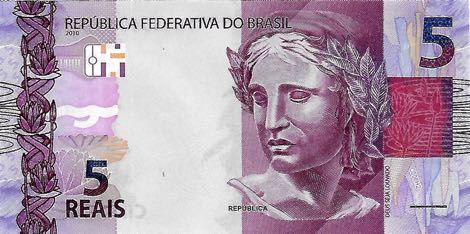 5 reais (US$3.15), no date. Like P252, but new signatures (Guido Mantega and Alexandre Antonio Tombini). Intro: 2011.