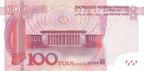 On 12 November 2015, the People’s Bank of China introduced a new 100-yuan note which is like P907, but new date, and enhanced anti-counterfeiting features, including purple-to-green windowed security thread with demetalized 100, denomination as registration device, denomination as SPARK, additional Omron rings, and vertical serial number in blue at right front.