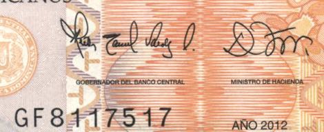 According to an article on Noticias Sin dated 16 September 2012, the Central Bank of Dominican Republic will issue a 200-peso (US$5.10) note with portions of the design changed in color from gray to green on 1 October to avoid confusion with the existing 50-peso note. The existing 50-peso (PNL) and 200-peso (P178) notes are shown above. The video accompanying the article shows the new note dated 2009, with DE LA RUE imprint, and the denomination spelled out as PESOS ORO. This is curious because the bank has issued three other notes dated 2011 denominated in PESOS DOMINICANOS, and apparently the Constitution of 26 January 2010 mandated the change of the name of the monetary unit.