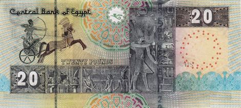 10 pounds (US$1.85). Like Pick 64, but new security thread type and placement, and the watermark is of a pharaoh’s bust with electrotype 10 instead of Tutankhamen's mask. This note has been confirmed dated 13.03.2007, 15.04.2008, 27.04.2008, and 28.04.2008 (all dates appear in Arabic on the notes). The latest date variety confirmed for Pick 64 is 22.11.2006.
