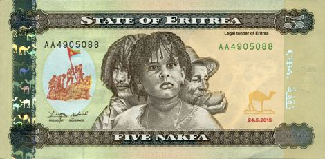 Brown, black, and green. Front: Eritrean fighters raising EPLF flag; triptych portrait; camel as registration device. Back: Camel; children studying in outside classroom; bank logo. Windowed security thread with demetalized BANK OF ERITREA. Watermark: Camel head. Printer: Unknown. 130 x 64 mm.