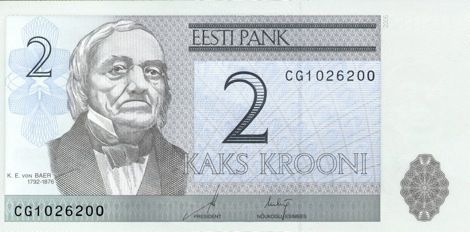 2 krooni (US$0.15), 2006. Issued 3 January 2007. Like Pick 70, but new date, new signatures (Andres Lipstok, Governor; Mart Sõrg, Chairman), and K. E. von Baer as watermark. Printer: (Giesecke & Devrient). 140 x 69 mm.