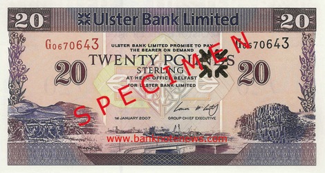 20 pounds (US$39.25), 1st JANUARY 2007 and 1st JANUARY 2008. Like P337, but new dates, new typeface for Ulster Bank Limited, Royal Bank of Scotland logo added, and new signature (Cormac McCarthy, GROUP CHIEF EXECUTIVE). Printer: DE LA RUE.