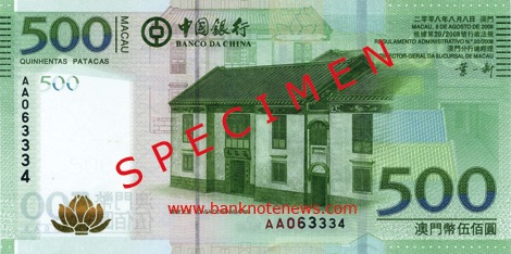 Green. Front: Lotus flower; CASA DO MANDARIM (Mandarin House) building. Back: Bridge; Banco da China in Macau headquarters building. Solid security thread with demetalized 500. Windowed security thread with demetalized BANK OF CHINA and bank logo. Watermark: Lotus flower with electrotype 500. Printer: Unknown. 158 x 80 mm. 8 DE AGOSTO DE 2008 (08.08.2008). Signature unknown. Introduced 05.01.2009.