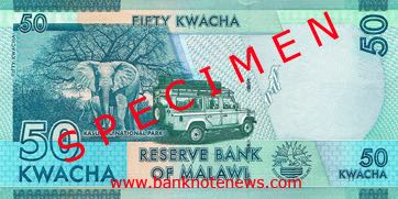 Light green, light blue, and orange. Front: Fish; fishermen in boat; Malawi map as registration device; Reserve Bank of Malawi headquarters building in Lilongwe; Inkosi Ya Makhosi Gomani II (Philip Zitonga Maseko). Back: Elephants, tree, and safari vehicle in Kasungu National Park; Malawi map; bank logo. Windowed security thread with demetalized RBM. Watermark: Inkosi Ya Makhosi Gomani II, electrotype 50, and Cornerstones. Printer: (TDLR). 128 x 64 mm.