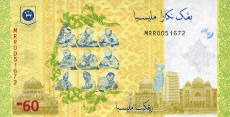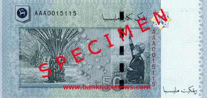 Green-blue. Front: National flower hibiscus; songket weaving patterns; Tuanku Abdul Rahman. Back: Oil palm trees; microbiology technology; Malaysia’s first prime minister, Tunku Abdul Rahman Putra Al-Haj declaring independence. Holographic stripe. Red-to-green windowed security thread with demetalized BNM RM50. Watermark: Rahman with electrotype 50. Printer: (G&D). 145 x 69 mm. No date. Signature 6. Intro: 15.07.2009. Replacement notes: Prefix ZB.