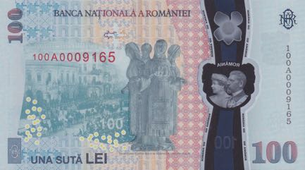 According to a press release dated 29 November 2018, on 1 December the National Bank of Romania introduced a 100-leu polymer note commemorating the 100th anniversary of the Great Union. The front depicts King Ferdinand I and Queen Maria, and the Great National Assembly in Alba Iulia, on 1 December 1918. The back depicts the arrival of the royal cortege in Bucharest, on 1 December 1918, and part of the mace of King Ferdinand I, together with four women in folk costumes typical of each united Romanian province: Bessarabia, Romania, Transylvania and Bukovina. 10,000 notes will be sold with leaflet for 150 lei each.