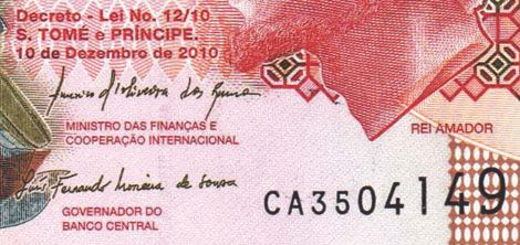 20,000 dobras (US$1), 10 de Dezembro de 2010. Like BCSTP B5 (P67), but new date and signatures (Americo de Oliveira dos Ramos and Luis Fernando Moreira de Sousa).