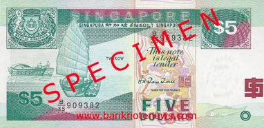 Singapore overprinted 1997 5-dollar ship note from sheet