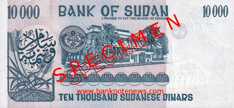 Sudan 10,000-dinar specimen dated 1996 confirmed
