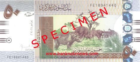 50 pounds, July 9 2006. Issued January 9, 2007. Yellow. Front: Natural resources theme with fish, rhinoceros, elephants, ape in tree, water buffalo, zebras, and giraffe; map. Back: Bank logo; camels, goats, and cattle. Holographic stripe. 2-mm wide windowed security thread with demetalized CBOS 50 LS and Arabic text. Watermark: Secretary bird and electrotype LS 50. Printer: (Sudan Currency Printing Press). 165 x 74 mm.
