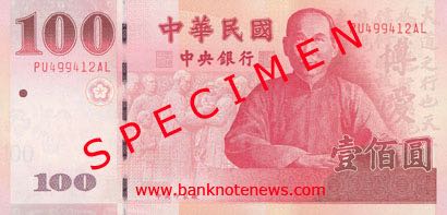On 6 January 2011, the Central Bank of the Republic of China (Taiwan) issued a new 100-dollar (US$3.45) legal tender circulating commemorative in celebration of the 100th anniversary of the founding of the Republic of China. The red paper note measures 145 × 70 mm and features a portrait of Dr. Sun Yat-Sen on the front, and the Chung-Shan Building on the back.