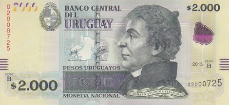 Black, yellow, purple, and blue. Front: Denomination as registration device; coat of arms; laurels, buff-necked ibis (Theristicus caudatus) bird, and microscope; Dámaso Antonio Larrañaga; map of Uruguay in purple OVI. Back: Biblioteca Nacional 26 de Mayo de 1816 (National Library 26 May 1816); laurels, buff-necked ibis (Theristicus caudatus) bird, and microscope. Holographic windowed security thread. Watermark: José Gervasio Artigas and electrotype Dos Mil and 2000 stacked three times. Printer: OBERTHUR technologies. 159 x 74 mm.