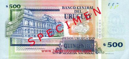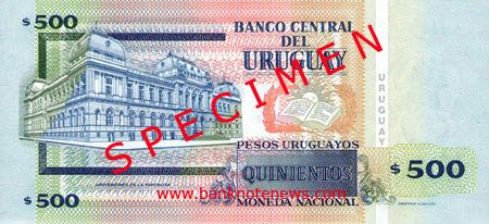Blue, purple, red, and green. Front: Denomination as registration device; coat of arms; laurels, open book, and rising sun as registration device; Alfredo Vásquez Acevedo; map of Uruguay as SPARK patch. Back: Universidad de la República (University of the Republic) building in Montevideo; laurels, open book, and rising sun. Holographic windowed security thread. Watermark: José Gervasio Artigas and electrotype Quinientos and 500 stacked three times. Printer: OBERTHUR technologies. 159 x 74 mm.