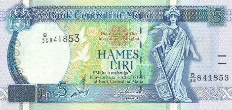 5 lats (US$10.55), 2007. Like P49, but new date, new signature (Rimsevics, Governor), and new security features, including two relief inscriptions of the nominal value imprinted above the oak-leaf registration device, parallelagram of LATVIJAS BANKA microprinting beneath large 5 in OVI at left. Starting serial number suffix apparently R with replacement notes presumably continuing to use Z suffix. 130 x 65 mm.