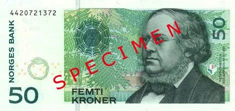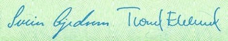 50 kronor (US$7.95), (200)4. Issued March 15, 2006. Like P62, but new signatures (Jan Bergqvist and Lars Heikensten), 2-mm wide solid security thread with repeating 50, holographic stripe, microtext, Omron rings, 50 as registration device and electrotype watermark, irridescent stripe on back. Printer: Tumba Bruk. 120 x 77 mm.