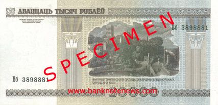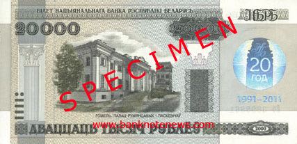 According to a press release dated 18 November 2010, the National Bank of the Republic of Belarus commemorated its 20th anniversary by issuing a 20,000-ruble (US$6.60) note on 1 December. Only 3,000 notes will be issued in special booklets. The commemorative is based upon the note of the same denomination issued in 2000 (Pick 31), but with a hologram over the watermark reading "NB 1920 1991-2011."