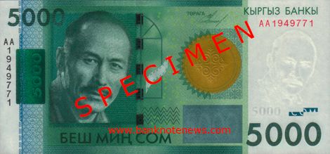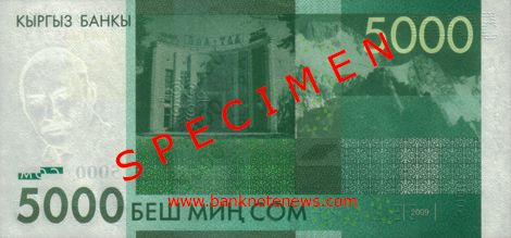 The National Bank of the Kyrgyz Republic introduced a 5,000-som note (US$122) on 2 March 2009. The front of the note features a portrait of actor, writer, and sportsman Suimenkul Chokmorov. On the back is Ala-Too, one of the oldest cinemas of the capital city of Bishkek. Previously the largest denomination was the 1,000-som note issued in 2000.