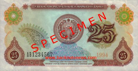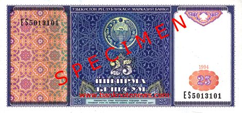 Uzbekistan unissued 25-som note dated 1994 confirmed