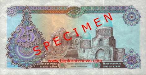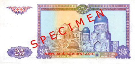 The following 25-som note from Uzbekistan is dated 1994 and depicts the Kazi-Zadé Rumi mausoleum in the Shakhi-Zinda necropolis in Samarkand, which also appears on the issued note of the same denomination (B207). However, the note with the specimen serial number of AB1234567 is printed on smaller (120 x 62 mm versus 144 x 68 mm) paper than the issued note. The paper has the same star pattern watermark and solid security thread as the 1- and 3-som notes (B203, B204).