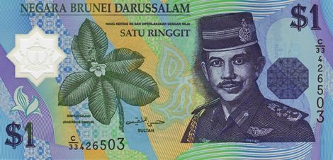 Green and brown. Front: Pangarut timun dendang (passiflora foetida) flower; Sultan Hassanal Bolkiah Mu’izzaddin Waddaulah wearing uniform and cap; coat of arms. Back: Legislative Council (Parliament) building in Bandar Seri Begawan. No security thread. Watermark (shadow image): Sultan. Printer: (NPA). 181 x 90 mm. Polymer. 2006. Signature 1. Intro: 28.12.2006.