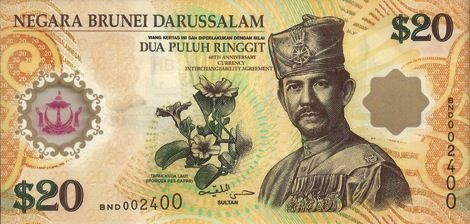 20 ringgit (US$13.10), 2007. Issued 27 June 2007. Orange. Novel serial numbers, A prefix, see-through window with red crest, and gold OVD with HB as latent image. Portrait of Sultan Hassanal Bolkiah at right, Ipomoea Pes-capre (plant that symbolises the treaty) at center. On back: Singapore’s splanade and buildings along the city’s waterfront at left; the Sultan Omar Ali Saifuddien mosque, Royal Barge, and water village at right. Polymer. 149 x 72 mm.