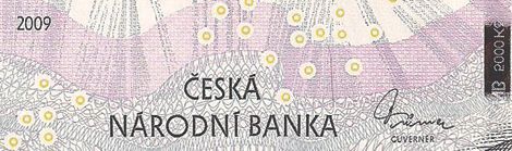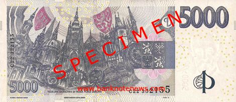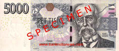 The 2009 note is signed by Governor Tůma and bears series letter C. Among its new security features are “bichrome patterned iridescent metallic strip of overlapping gold and purple with recurring quartets of linden leaves and negative 5000s” to the right of the portrait on the front of the note. The note is also protected by Omron rings, 3-mm wide puce-to-green color-shifting windowed security thread with demetalized ČNB 5000 Kč, and the watermark of Tomáš Garrigue Masaryk now has 5000 and sitting eagle electrotype elements.