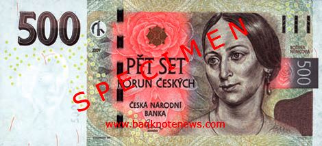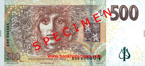 - windowed security thread is now 3-mm wide with cross-hatched demetalized ČNB 500 Kč and it changes color from puce-to-green