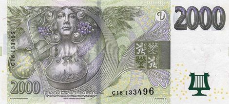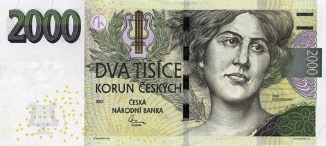 2,000 korun (US$93.65), 2007. Issued July 2, 2007. Like Pick 22, but new date, new signature (Tuma, GUVERNER), and many additional security features, including bichrome patterned iridescent strip of overlapping gold and blue, series other than A and B, Omron rings, 2000 and small ornament added as electrotype wmk, 3.0-mm windowed puce-to-green security thread with hatched CNB 2000 Kc, and additional UV features. Printer: State Printing Office, Prague.