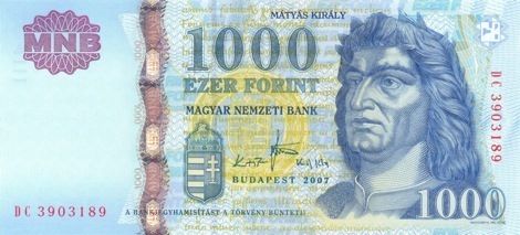 1,000 forint (US$4.30), 2009. Like Pick 195, but new date, new signatures, Omron rings added to front and back in watermark field, black serial numbers instead of red ones, and a silver-holographic security thread instead of a golden-holographic one.