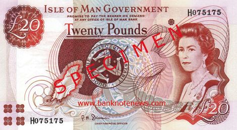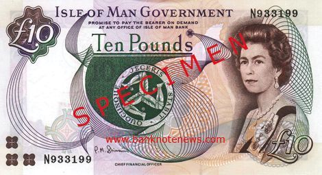 The 10-pound (US$15.90) note issued by the Isle of Man Government has been confirmed with Q prefix and the printer imprint at lower center on back changed to DE LA RUE.