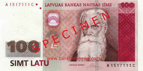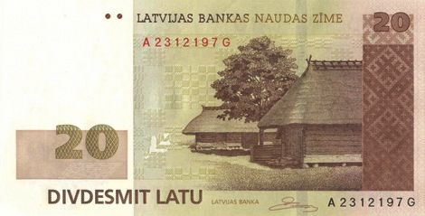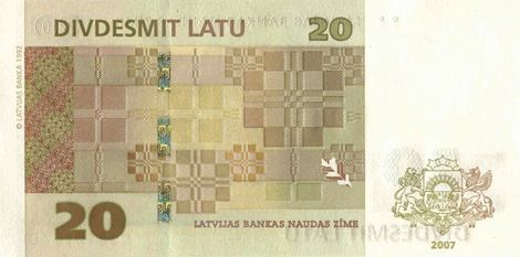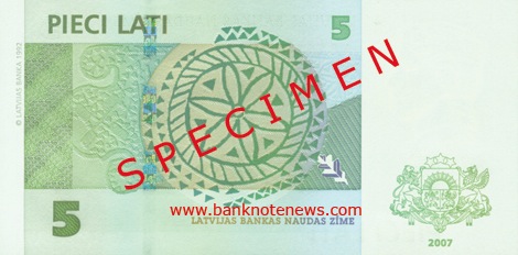 The Bank of Latvia has issued new 5- and 20-lat notes dated 2009. The 5-lat (US$10.10) note is like Pick 52, but new date. The 20-lat (US$40.35) note is like Pick 51, but new date. Both carry the same signature (Ilmars Rimsevics, Governor).
