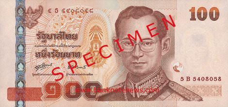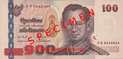 On 4 May 2010, Bank of Thailand issued a new 100-baht (US$3.10) note to mark the king’s 60th wedding anniversary. The note is the same as the current 100 baht (P114) but the back features the king & queen standing together. Apparently 9,999,999 notes were printed. A specimen without overprint and with all-zero serial numbers and a specimen number at lower right back has also been confirmed.