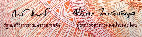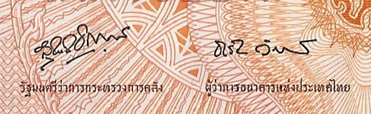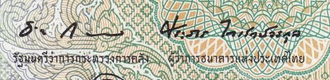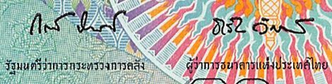 A new 100-baht note (US$2.80) has been reported with the signature of สุชาติ ธาดาธำรงเวช (Suchat Thadathamrongwet), who served from September 24 to December 19, 2008. Given his very short term in office, Suchat’s notes may be extremely hard to find in the future. Only this denomination has been reported with this signature combination (the signature of the governor remains that of ธาริษา วัฒนเกส, Tharisa Watthanakase), who has served since November 8, 2006.