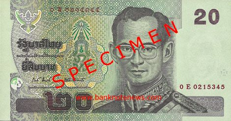 The new notes have high-technology anti-counterfeiting measures. They also have Braille so the blind can identify the value. The watermark of Thai numeral 20 is specially transparent when held against the light; the green security thread embedded into the paper will change to the color of red-purple when user tilts the new banknotes; and the use of raised features and matching element techniques on denomination numeral. The banknotes are made of better paper quality to provide the longer life cycle.