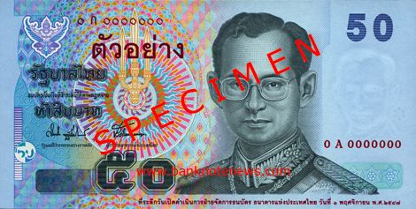 50 baht (US$1.45). Like Pick 112 but new signatures of Korn Chatikavanij (กรณ์ จาติกวณิช, Minister of Finance) and Tharisa Watthanaket (ธาริษา วัฒนเกส, Governor ).