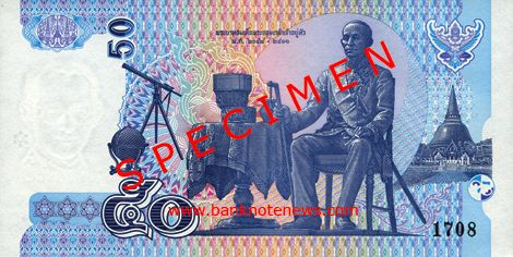 The Thai text at lower right back of the 50-baht note originally read โทษฐานปลอมแปลงธนบัตร คือจำคุกตลอดชีวิตหรือจำคุกอย่างสูงยี่สิบปี และปรับอย่างสูงสี่หมื่นบาท (Penalty for making counterfeit banknotes is life imprisonment, or up to twenty years of imprisonment and up to forty thousands Baht of fine), but in 2018 was changed to read การปลอมแปลงธนบัตรเป็นความผิด ต้องระวางโทษตามประมวลกฎหมายอาญา (Making counterfeit banknotes is a crime, and will be punished due to Criminal law).
