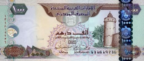 Brown. Front: Saker falcon head as registration device; OVI coat of arms; Al Hosn Palace (White Fort) in Abu Dhabi. Back: Saker falcon; Abu Dhabi skyline with Corniche; Saker falcon head. Holographic stripe with denomination. 3-mm wide windowed security thread with demetalized UAE 1000. Watermark: Saker falcon head with electrotype 1000 and coffee pot. Printer: Unknown. 163 x 70 mm.